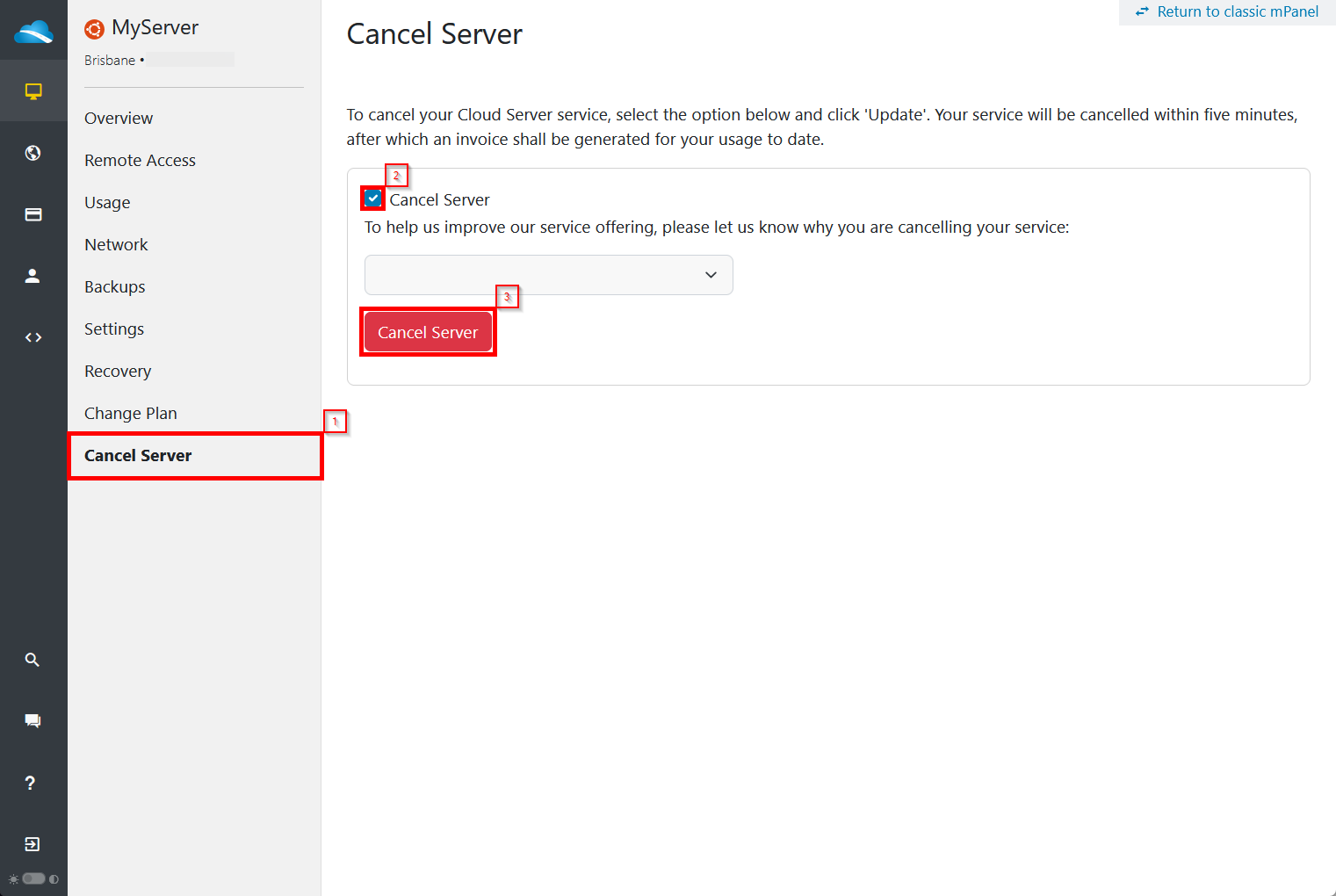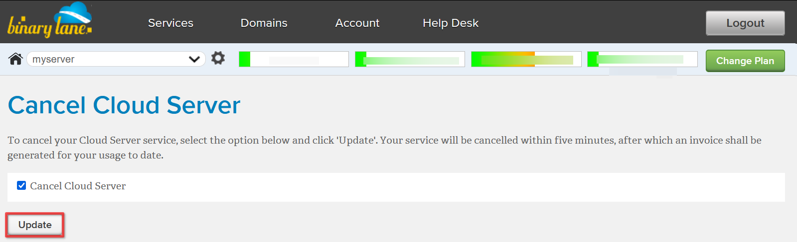 Check the box 'Cancel Cloud Server', then select 'Update' to finalise the cancellation of your server: