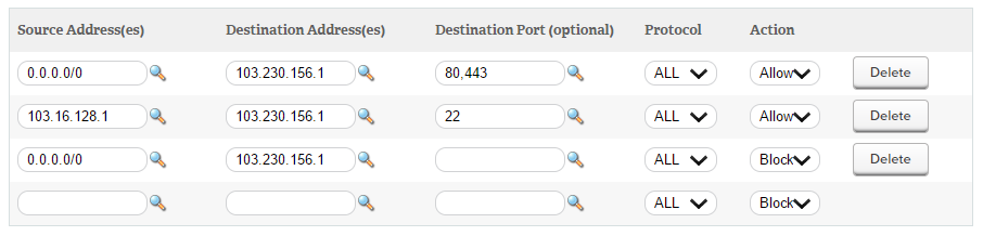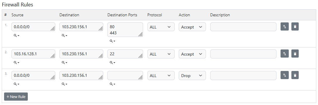 Through our management panel customers can configure a list of rules that determine what happens to VPS traffic. Each rule consists of: