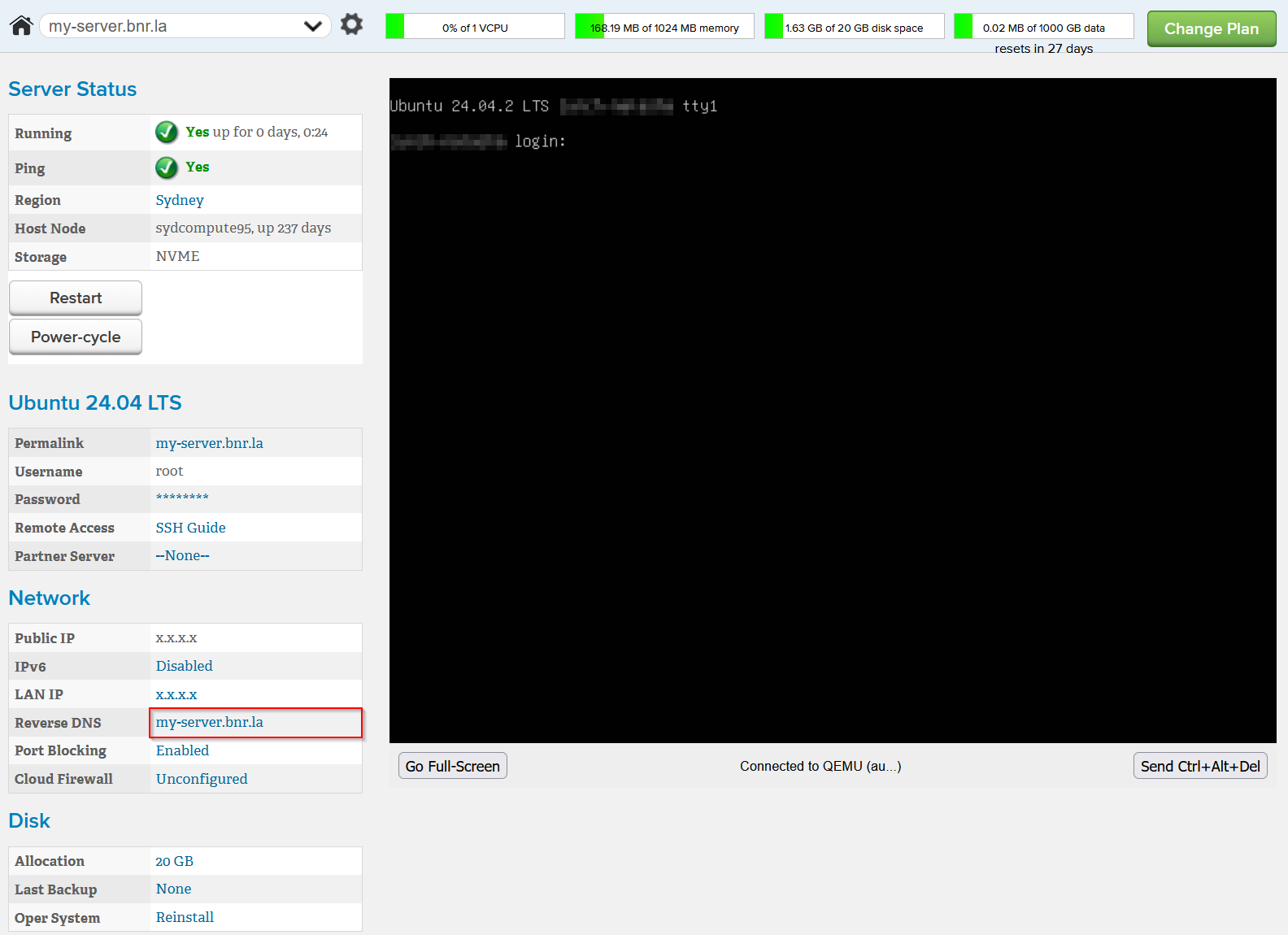 - In the server page, locate the Reverse DNS line in the 'Network' section
