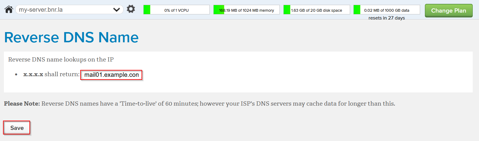 - Enter the hostname you want for reverse DNS.