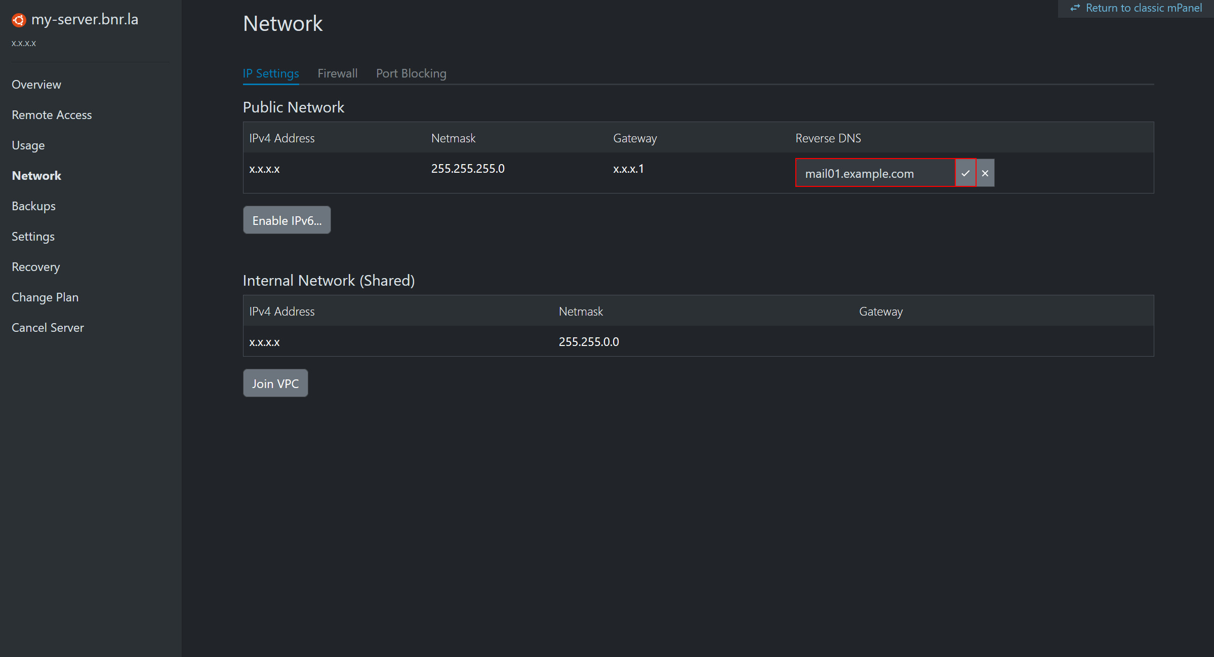 - Click the same blue hypertext link next to Reverse DNS (you can also access the 'Reverse DNS Name' settings page for your server by clicking 'Network' from the left-hand pane).
