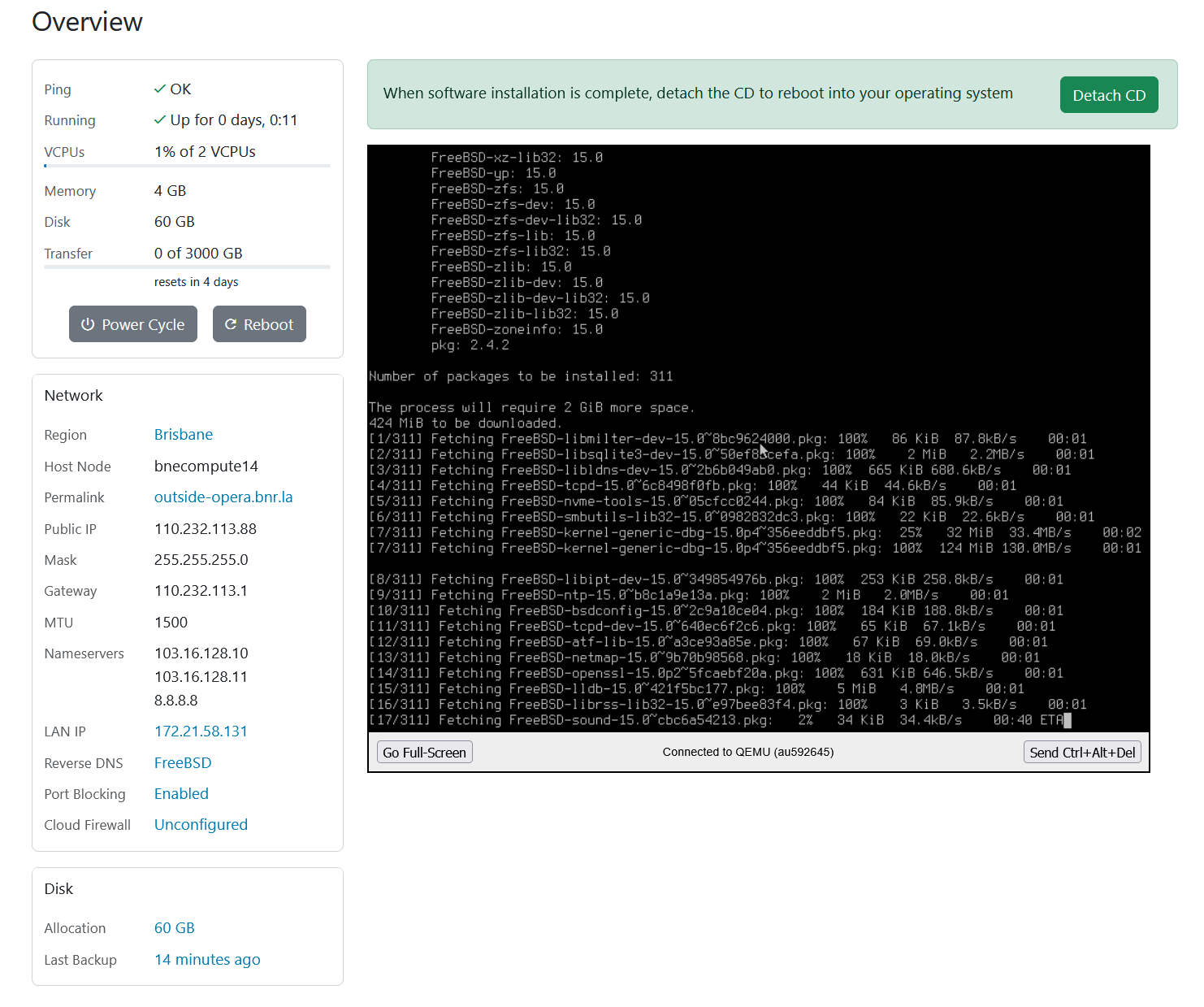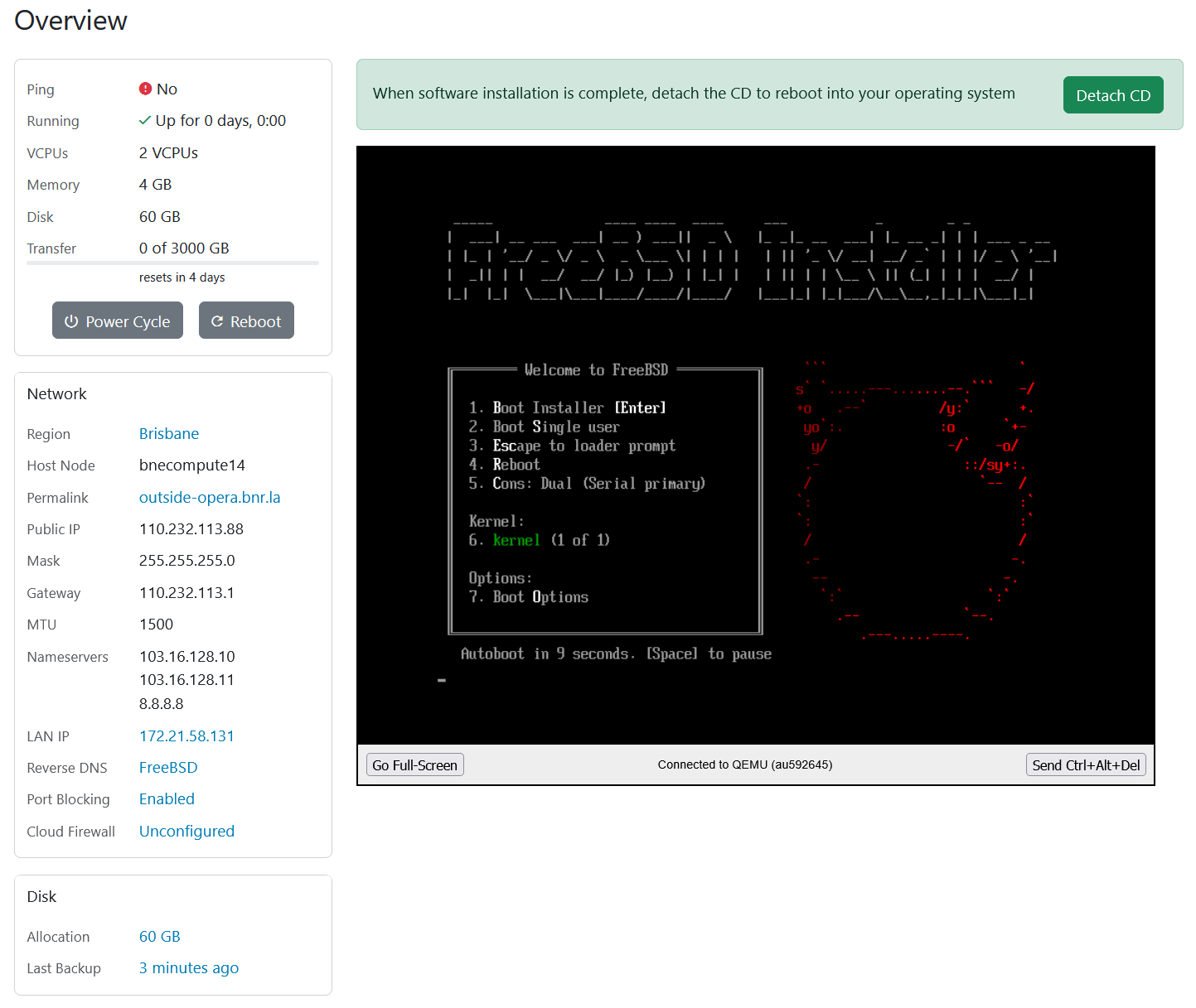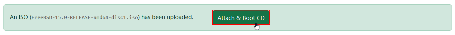 - Click Attach & Boot for the uploaded FreeBSD ISO.