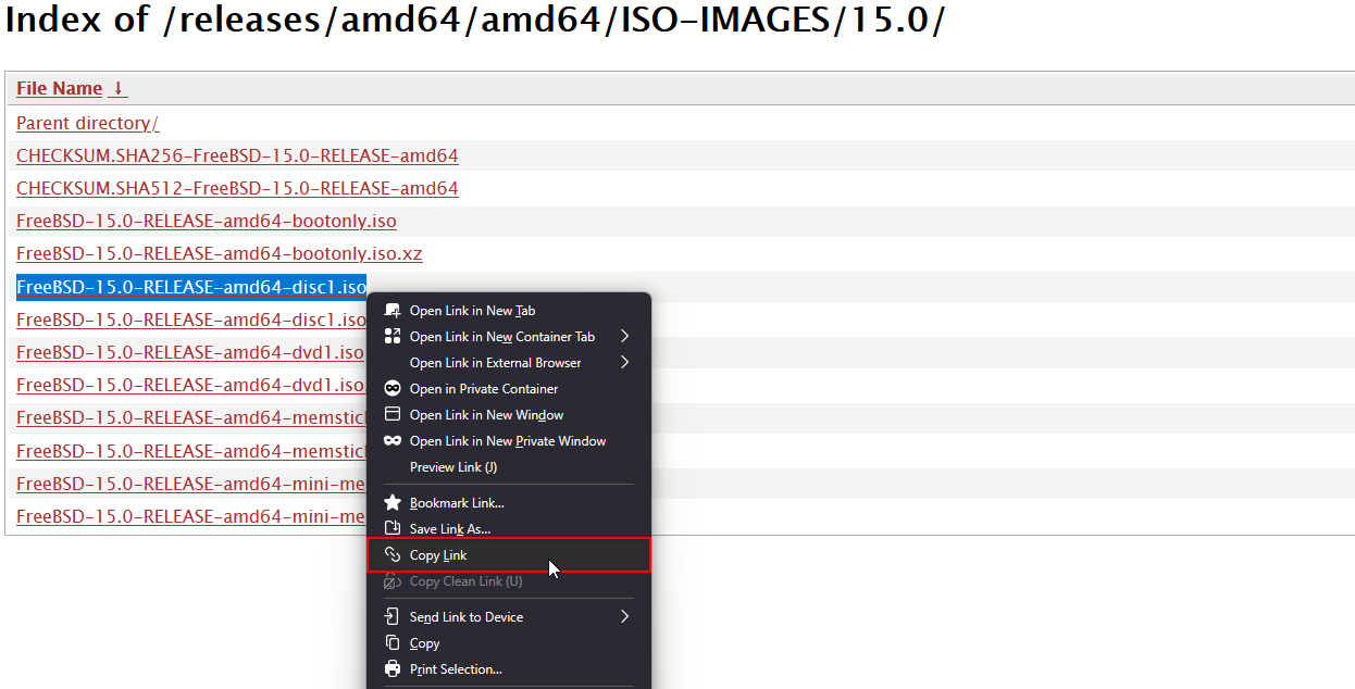 FreeBSD-15.0-RELEASE-amd64-disc1.iso. - Right-click the file and choose Copy URL.