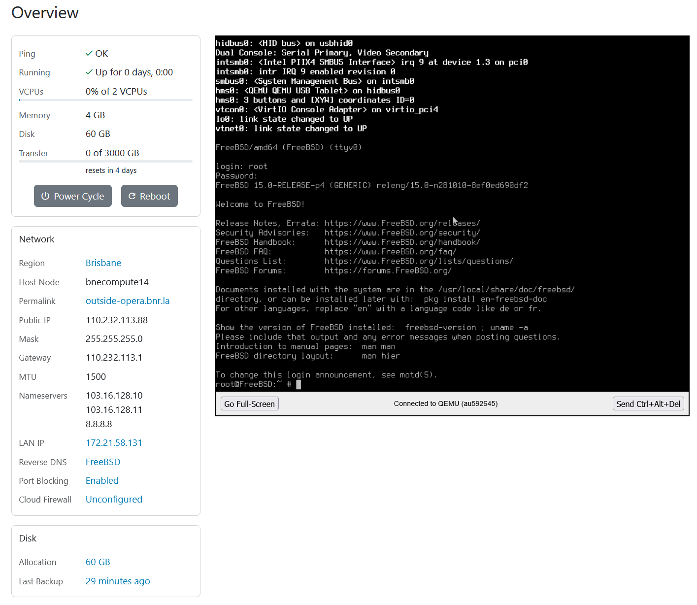 Install FreeBSD 15 on your BinaryLane VPS using the BYO (Bring Your Own) Operating System feature with UEFI enabled. This guide walks through the full process from server creation to the first successful login.