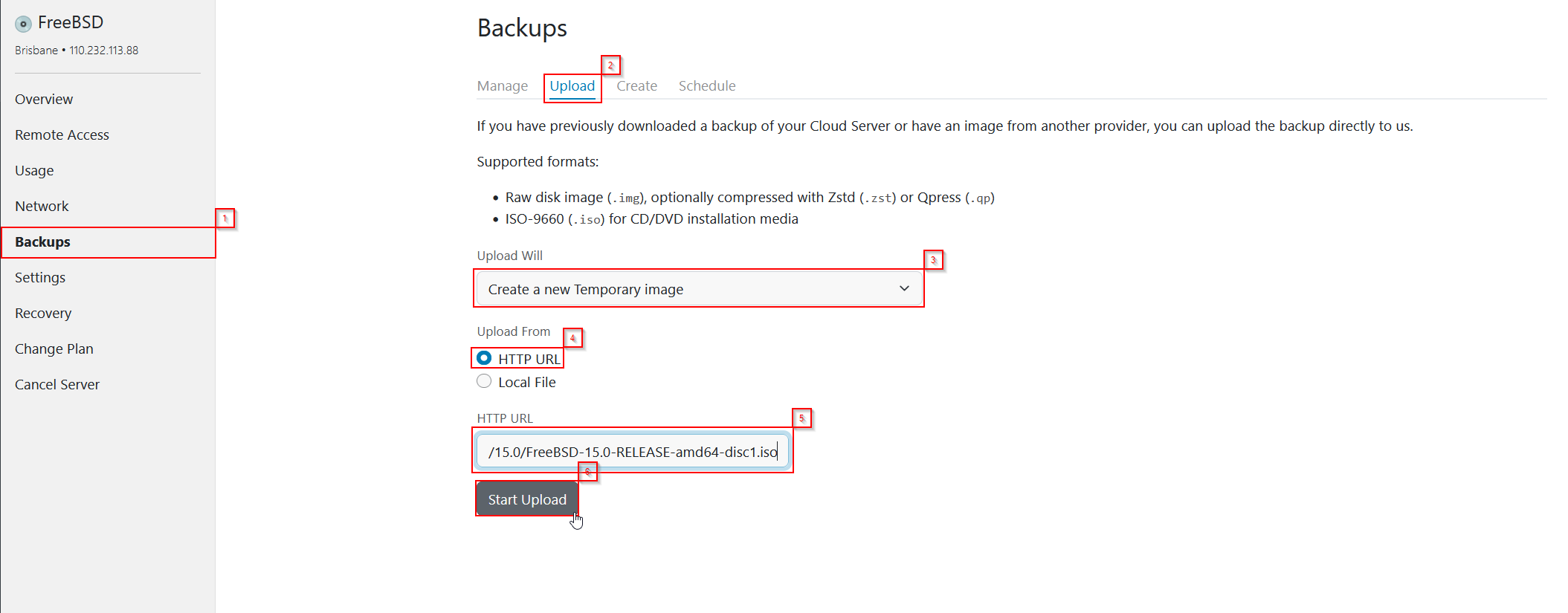 - Paste the FreeBSD ISO URL you copied earlier into the HTTP URL field.